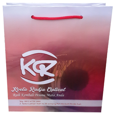 Tas Optik ini terbuat dari bahan ivory dengan permukaan tas lebih halus. Kategori warna cetak pada tas ini yaitu full warna. terdapat empat desain yaitu depan, belakang, samping kiri, dan samping kanan. Jenis handel yang digunakan adalah handel tali kur berwarna merah. Ukuran pada tas ini dalam cm yaitu 25 x 5 x 30