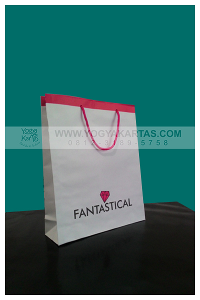 Tas Kertas dengan Label Fantastical yang kami produksi menggunakan bahan kertas kraft paper dan Kertas Ivory dengan jenis warna cetak dua warna yaitu Pink dan Hitam. Jenis handel yang digunakan adalah handel tali berwarna pink. Tas ini permkaannya halus baik luar maupun dalam.
